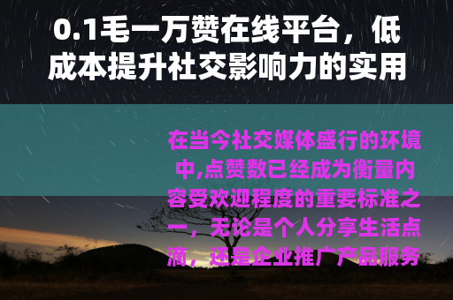 在当今社交媒体盛行的环境中,点赞数已经成为衡量内容受欢迎程度的重要标准之一,无论是个人分享生活点滴,还是企业推广产品服务,更高的点赞量往往能带来更广泛的关注和更强的信任感,自然积累点赞需要时间与持续的内容投入,这让许多希望快速见效的用户开始寻找更便捷的途径,一种被称为“0.1毛一万赞在线平台”的服务逐渐进入公众视野,它以极低的成本和高效的交付,为用户提供了一种增加点赞数量的新选择。