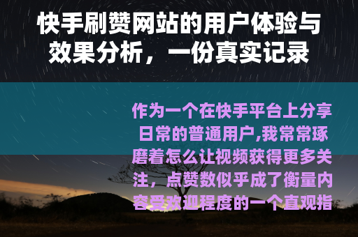 作为一个在快手平台上分享日常的普通用户,我常常琢磨着怎么让视频获得更多关注,点赞数似乎成了衡量内容受欢迎程度的一个直观指标,偶尔听朋友提起“刷赞网站”,我便好奇起来,决定亲自试试这些服务,看看它们到底是怎么一回事。