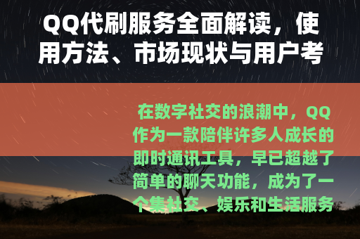 QQ代刷是一个复杂且多维的现象,涉及技术、市场和社会心理等多个方面,通过本文的探讨,我们希望读者能更全面地理解其运作方式和使用考量,无论是选择代刷还是其他途径,关键在于平衡便捷性与安全性,以提升个人社交体验为目标,在数字世界中,理性思考和适度参与总是值得推崇的态度,愿每位QQ用户都能找到适合自己的方式,享受社交带来的乐趣与连接。