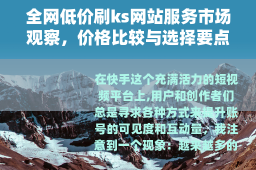 在快手这个充满活力的短视频平台上,用户和创作者们总是寻求各种方式来提升账号的可见度和互动量,我注意到一个现象:越来越多的人在讨论“全网低价刷ks网站”服务,这些服务承诺以更实惠的价格帮助用户增加粉丝、点赞或播放量,作为一个长期关注数字营销趋势的人,我决定花时间深入了解这一市场,不带有任何预判,只是从实际角度出发,看看这些服务是如何运作的,以及用户如何在其中做出选择,这并不是为了揭露什么或警告什么,而是简单地分享我所学到的信息,希望能为感兴趣的人提供一个参考。