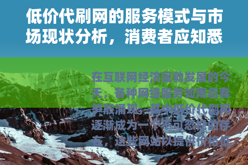 在互联网经济蓬勃发展的今天,各种网络服务如雨后春笋般涌现,其中低价代刷网逐渐成为一个不可忽视的存在,这些网站以提供价格低廉的刷量服务为核心,涵盖了电商平台的销量提升、社交媒体的粉丝增长、网站流量的短期爆发等多个领域,对于许多初创企业、小型商家乃至个人用户来说,这种服务似乎提供了一条快速达成目标的捷径,在这背后,低价代刷网究竟如何运作?它如何影响市场生态?消费者在面对这些选择时,又该如何理性评估?本文将从多个角度展开讨论,试图以客观的视角解析这一现象,并避免陷入简单的二元评判。