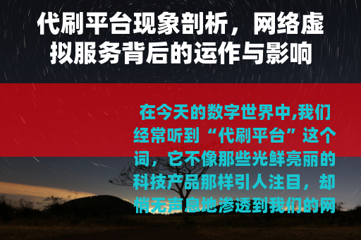 在今天的数字世界中,我们经常听到“代刷平台”这个词,它不像那些光鲜亮丽的科技产品那样引人注目,却悄无声息地渗透到我们的网络生活里,你可能在电商网站看到某个商品突然销量飙升,或者在社交媒体上发现一个账号短时间内粉丝暴涨,这些现象背后,往往有代刷平台的影子,这篇文章不是要吓唬你或揭露什么秘密,而是想以一个普通观察者的角度,聊聊代刷平台是什么、它如何运作、以及它给我们的网络环境带来了哪些变化,我会尽量用平实的语言,分享一些实际案例和思考,避免那些耸人听闻的词汇,只聚焦于事实和分析。