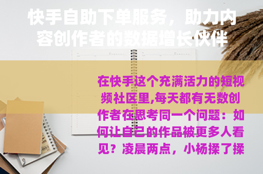 在快手这个充满活力的短视频社区里,每天都有无数创作者在思考同一个问题:如何让自己的作品被更多人看见?凌晨两点,小杨揉了揉发酸的眼睛,刚把剪辑好的带货视频发布出去,这是她这个月第30条作品,内容精心打磨,但点赞和评论的增长速度却像蜗牛爬行,她不是没想过办法,互动、蹭热点、优化标签,都试过了,效果总是不温不火,直到有一天,她在与一位同行交流时,听到了一个词——“自助下单”,对方没有多说,但她心里却留下了印象,这并非什么神秘操作,而是逐渐被许多创作者视为日常运营中,一个可以自主利用的辅助工具。