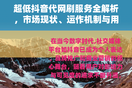 在当今数字时代,社交媒体平台如抖音已成为个人表达、品牌推广和商业营销的核心舞台,随着用户对影响力与可见度的追求不断升温,一种称为“代网刷”的服务悄然兴起,尤其以“超低”价格吸引着广泛关注,这类服务通常承诺以实惠的成本提升抖音账号的粉丝量、点赞数或评论互动,帮助用户在短时间内获得更高的社交曝光,对于许多新手或经验丰富的用户来说,这背后涉及的细节、效果及选择方式往往模糊不清,本文旨在以平实的语言,深入剖析超低抖音代网刷的方方面面,从基本概念到市场动态,再到实际应用,提供一份详尽的参考,助您在不依赖空话或标准框架的情况下,理解这一现象。