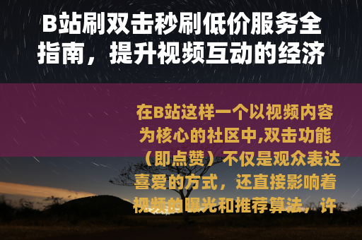 在B站这样一个以视频内容为核心的社区中,双击功能(即点赞)不仅是观众表达喜爱的方式,还直接影响着视频的曝光和推荐算法,许多创作者,尤其是刚起步的新手,希望快速提升视频的双击数量,以吸引更多关注,这时,刷双击秒刷低价服务逐渐进入人们的视野,成为了一种备选的推广手段。