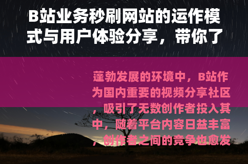蓬勃发展的环境中,B站作为国内重要的视频分享社区,吸引了无数创作者投入其中,随着平台内容日益丰富,创作者之间的竞争也愈发明显,在这样的背景下,一些提供“B站业务秒刷网站”的服务逐渐进入人们视野,这些网站通常承诺能快速提升视频的播放量、点赞数或粉丝数量,为创作者提供数据增长的支持,这些服务究竟如何运作?用户体验又怎样?让我们从实际角度聊一聊。