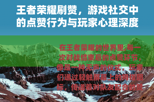 在王者荣耀的世界里,每一次对战结束后的点赞环节,像是一种无声的仪式,玩家们通过轻触屏幕上的拇指图标,传递着对队友配合的赞许或对手技艺的认可,我的游戏生涯中,点赞数悄然累积,它们安静地躺在个人资料栏里,成为虚拟身份的一部分,随着游戏社交功能的深化,一种现象逐渐浮现:部分玩家的点赞数在短时间内快速增长,这并非源于密集对局,而是通过其他途径实现,这种现象,常被称为“刷赞”,它像一面镜子,映照出游戏社群中复杂的互动与需求。