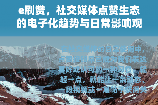 从更广泛的角度看,e刷赞也反映了数字时代社交行为的一种演变,它提醒我们,在线互动中,数量并不总是等同于价值,无论是个人还是组织,在追求关注度的同时,或许可以更多地聚焦于内容本身的创造与分享,真实的连接往往源于持续的投入和诚恳的交流,而非短暂的数字提升,通过培养这种意识,我们可以更好地享受社交媒体带来的便利,同时维护一个更具实质性的网络空间。