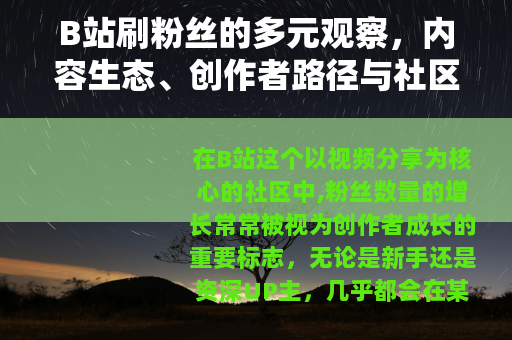 在B站这个以视频分享为核心的社区中,粉丝数量的增长常常被视为创作者成长的重要标志,无论是新手还是资深UP主,几乎都会在某个时刻关注自己的粉丝数据,期望通过更多的关注来扩大影响力,随着平台的发展,一种通过非自然手段快速提升粉丝数的做法——通常被称为“刷粉丝”——逐渐进入人们的视野,这种现象并非孤立存在,它折射出数字时代内容创作中的一些普遍选择与挑战,我们不谈耸动的词汇,只从日常的观察出发,聊聊这背后的点滴。