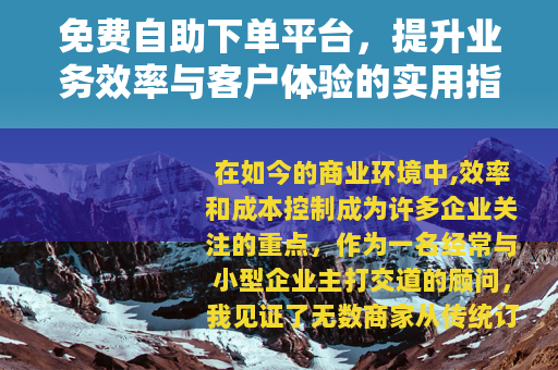 在如今的商业环境中,效率和成本控制成为许多企业关注的重点,作为一名经常与小型企业主打交道的顾问,我见证了无数商家从传统订单管理方式转向数字化工具的历程,免费自助下单平台逐渐成为热门选择,它不仅简化了流程,还为客户带来了便利,我遇到了一位经营手工艺品店的创业者张先生,他的故事让我对这种平台产生了更深兴趣,过去,张先生依靠纸笔记录订单,常常漏单或混淆客户需求,导致投诉不断,但自从他尝试了一个免费自助下单平台后,订单处理变得井井有条,客户反馈也转为积极,这种转变并非偶然,而是免费自助下单平台价值的体现,本文将围绕这一主题,从实际应用出发,探讨其功能、优势、使用方法和未来趋势,旨在为商家提供一份详尽的参考,帮助他们在竞争中找到更高效的运营路径。