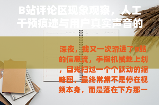 深夜,我又一次滑进了B站的信息流,手指机械地上划,目光扫过一个个跃动的缩略图,最终常常不是停在视频本身,而是落在下方那一片不断滚动的评论区里,那里时而热闹如市集,金句频出,梗图乱飞;时而又会出现一片整齐划一的赞美,或是一段段似曾相识、措辞精致的段落,像是精心排练后的合唱,这已经是许多B站用户,包括我在内,熟悉的日常景观了,我们似乎不再惊讶于某些视频下方,评论增长的速度偶尔会显得过于“澎湃”,或是某些账号总能用相似的句式,在不同的角落留下自己的脚印。