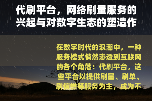 在数字时代的浪潮中,一种服务模式悄然渗透到互联网的各个角落:代刷平台,这些平台以提供刷量、刷单、刷信誉等服务为主,成为不少商家和个人在网络世界中的隐形助手,清晨,一位电商卖家打开电脑,查看店铺的销售数据,昨晚,他通过一个代刷平台下单,增加了商品销量和好评,几小时后,店铺的排名在搜索结果中上升,引来更多真实顾客,这并非孤立现象,而是当今网络经济中一个常见的片段,代刷平台的存在,折射出数字生态中的复杂需求和行为模式,它们不仅改变了竞争格局,还重新定义了在线信誉的构建方式,本文将深入探讨代刷平台的运作机制、产生背景、多面影响以及未来走向,以客观视角呈现这一现象的全貌。