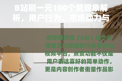 在哔哩哔哩(B站)这个以弹幕文化和原创内容著称的视频平台,点赞功能不仅是用户表达喜好的简单动作,更是内容创作者衡量作品影响力和获得推荐流量的关键指标,近年来,一种以“一元100个赞”为标榜的服务在网络上悄然出现,以极低成本提供大量点赞,吸引了不少用户的目光,这一现象并非孤立,它折射出数字内容生态中量化数据对个人行为的驱动,以及平台机制与外部市场之间的微妙互动,本文将从B站点赞系统的运作、刷赞服务的兴起、用户心理动机、对社区生态的潜在影响以及平台应对措施等方面,进行深入探讨,旨在提供一个全面的视角,而不涉及道德评判或简单定论。