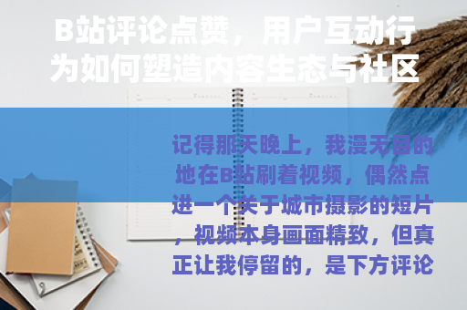 记得那天晚上,我漫无目的地在B站刷着视频,偶然点进一个关于城市摄影的短片,视频本身画面精致,但真正让我停留的,是下方评论区——一条讲述自己与这座城市回忆的评论,短短几句话,却收获了上万个点赞,我下意识地也给了一个赞,然后不禁思考:这个小小的点赞按钮,究竟有什么魔力?为什么我们会为一条评论驻足,甚至因此影响对整个视频的感受?在B站这样一个以弹幕和评论文化著称的平台,点赞行为早已超越了简单的认同表达,它交织着用户心理、社区互动与内容传播的复杂脉络,我想以普通用户的视角,分享一些对B站评论点赞的观察与思考,或许没有宏大的理论框架,但希望从细微处捕捉那些真实存在的瞬间。