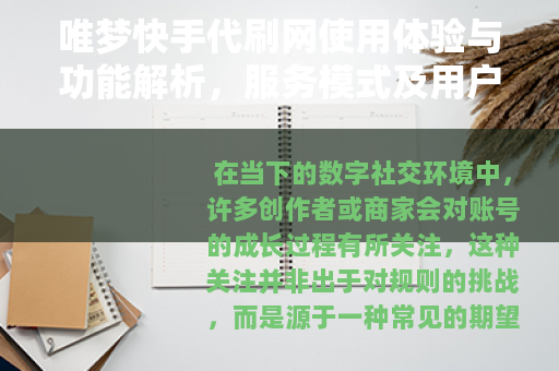 在当下的数字社交环境中,许多创作者或商家会对账号的成长过程有所关注,这种关注并非出于对规则的挑战,而是源于一种常见的期望:希望自己付出的努力能更快地被看见,在这样的背景下,一些网络服务应运而生,它们试图在平台规则与用户需求之间,提供一种辅助性的选择,唯梦快手代刷网便是其中之一。