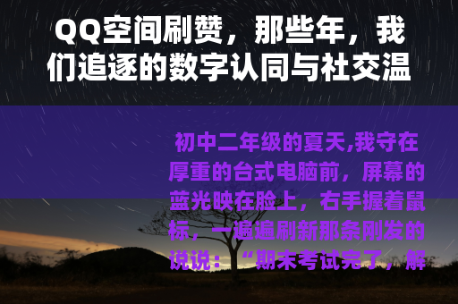 初中二年级的夏天,我守在厚重的台式电脑前,屏幕的蓝光映在脸上,右手握着鼠标,一遍遍刷新那条刚发的说说:“期末考试完了,解放!” 每隔几分钟,右下角的小喇叭图标弹出“+1”的提示,心里便轻轻跳一下,同桌凑过来问:“你这条能破百吗?” 我没回答,但手心里微微出了汗,那时候,“赞”是一种货币,流通在名为QQ空间的国度里,我们小心翼翼地经营着每一条状态,像呵护刚发芽的豆苗,而“赞”就是阳光和雨水。