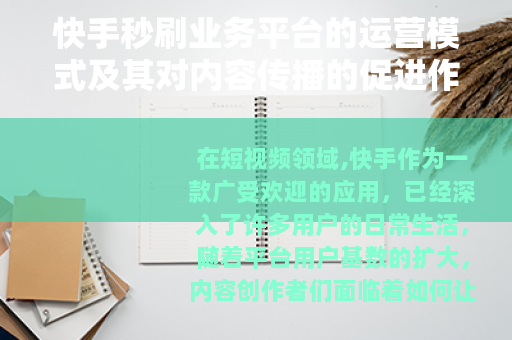 在短视频领域,快手作为一款广受欢迎的应用,已经深入了许多用户的日常生活,随着平台用户基数的扩大,内容创作者们面临着如何让自己的作品脱颖而出的问题,在这种背景下,一种被称为“秒刷业务平台”的服务逐渐浮现,它为创作者提供了一种快速提升内容曝光和互动数据的方式,这篇文章将从多个角度探讨这一现象,分析其运作机制、应用场景以及带来的影响,旨在提供一个全面的视角,帮助读者理解这一业务在短视频生态中的位置。