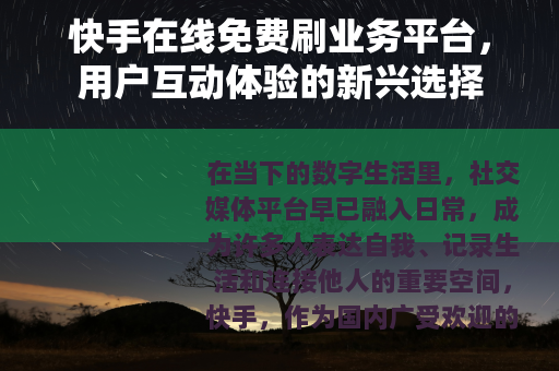 在当下的数字生活里,社交媒体平台早已融入日常,成为许多人表达自我、记录生活和连接他人的重要空间,快手,作为国内广受欢迎的短视频社区,其内容生态的活力很大程度上源自用户之间丰富多样的互动,点赞、评论、分享、关注,这些看似简单的数字行为,构成了平台活跃度的基础,也影响着内容创作者的热情与能见度,在这样的背景下,一些提供所谓“在线免费刷业务”的网络服务开始进入部分用户的视野,它们通常宣称能够以无需付费的方式,帮助用户提升其在快手平台上的某些互动数据,这种现象的出现,并非偶然,它与当前社交媒体生态的某些特质紧密相关。