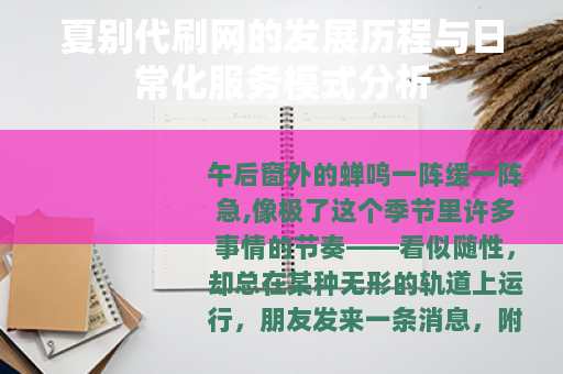 午后窗外的蝉鸣一阵缓一阵急,像极了这个季节里许多事情的节奏——看似随性,却总在某种无形的轨道上运行,朋友发来一条消息,附了个链接,随口提了句:“现在连这个都能找人帮忙了。”点开一看,是个界面简洁的网站,名字叫“夏别代刷网”,那名字有点意思,不张扬,甚至带点旧时书信结尾“夏别”的淡淡怅惘,做的却是最贴合当下快节奏需求的生意,这让我想起早些年,网络上类似的代刷服务还隐在论坛角落、QQ群深处,如今却有了这样规整的门面,它不像一个突然闯入的异类,倒更像是一株慢慢顺着墙根长起来的植物,不知不觉间,已是一片荫凉。