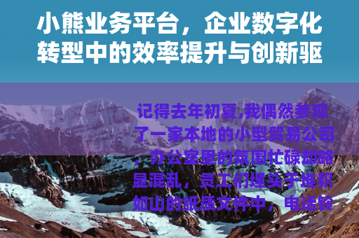 记得去年初夏,我偶然参观了一家本地的小型贸易公司,办公室里的氛围忙碌却略显混乱,员工们埋头于堆积如山的纸质文件中,电话铃声此起彼伏,而经理张先生则眉头紧锁,盯着电脑屏幕上分散的电子表格,他苦笑着告诉我,公司每天要处理上百笔订单,但依赖手工录入和邮件沟通,不仅耗时费力,还常常出错,导致客户抱怨连连,更让他头疼的是,随着业务扩展,这种传统方式已难以为继,就在那次交谈中,我提到了小熊业务平台——一个近年来在业界逐渐崭露头角的集成化业务管理工具,张先生起初持怀疑态度,但经过一番尝试,几个月后他主动联系我,语气中带着惊喜:“这平台简直改变了我们的工作方式。” 这个故事并非孤例,它折射出许多企业在当今快速变化的商业环境中面临的共同挑战,以及像小熊业务平台这样的工具如何成为解决问题的关键。