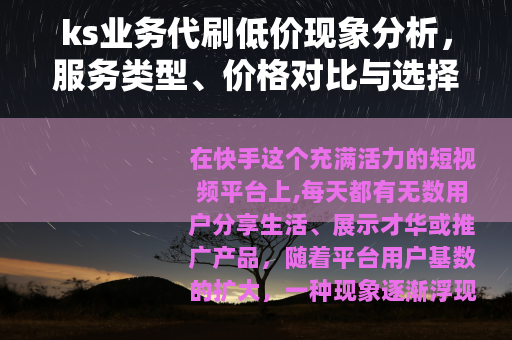 ks业务代刷低价服务是当前平台生态中的一个组成部分,它既有市场需求,也伴随复杂影响,作为用户,了解市场现状、服务类型和选择方法,可以帮助我们做出更合适的决策,但归根结底,快手的价值在于真实分享和连接,代刷只是工具之一,而非目的,希望这些观察能为你提供一些参考,让你在数字世界中走得更加稳健。