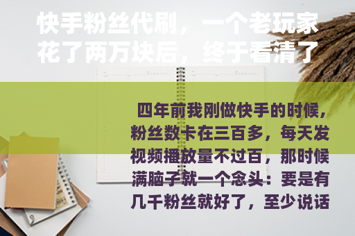 四年前我刚做快手的时候,粉丝数卡在三百多,每天发视频播放量不过百,那时候满脑子就一个念头:要是有几千粉丝就好了,至少说话有人听,于是我在网上搜“快手粉丝代刷”,跳出来一堆商家,价格便宜得离谱——十块钱买一千粉,二十块买五千粉,我当时想,这不就跟买流量一样吗?花点小钱买点面子,等真粉丝来了自然就能做起来。
