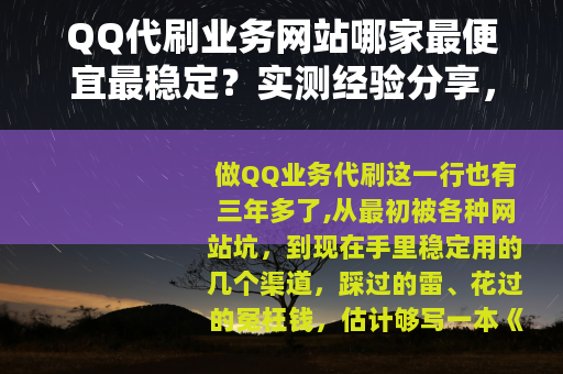 做QQ业务代刷这一行也有三年多了,从最初被各种网站坑,到现在手里稳定用的几个渠道,踩过的雷、花过的冤枉钱,估计够写一本《避坑指南》,最近又有不少朋友私下问我,到底哪个QQ代刷网站最便宜?哪个最稳定?今天干脆把我这些年的真实体验整理出来,不吹不黑,全是真金白银砸出来的经验。