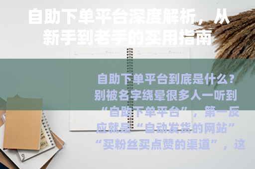 很多人一听到“自助下单平台”,第一反应就是“自动发货的网站”“买粉丝买点赞的渠道”,这种说法对,但也不全对,自助下单平台的本质是一个自动化交易中介——它把提供服务和购买服务的人连接起来,通过系统自动处理订单、自动发货、自动结算,几乎不需要人工干预。