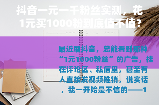 最近刷抖音,总能看到那种“1元1000粉丝”的广告,挂在评论区、私信里,甚至有人直接发视频推销,说实话,我一开始是不信的——1块钱能买1000个粉丝?这价格比白菜还便宜,但架不住好奇心,加上手头正好有个新注册的小号想测试一下,就决定亲自走一遍流程,看看这1块钱到底能换来什么。