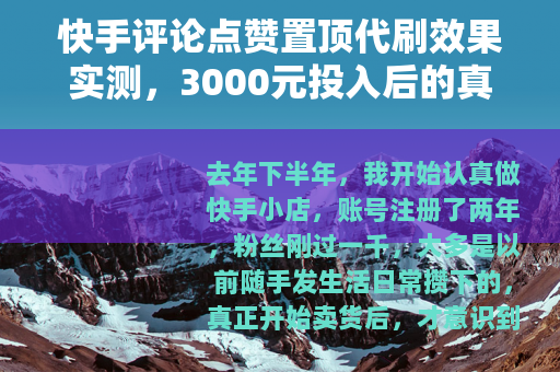 去年下半年,我开始认真做快手小店,账号注册了两年,粉丝刚过一千,大多是以前随手发生活日常攒下的,真正开始卖货后,才意识到评论区冷清有多要命——别人家的视频下面,用户你一句我一句聊得火热,置顶的那条好评往往能顶上几百个赞;而我的视频发出去,三五个点赞,零评论,偶尔冒出一条“怎么买”,也没人回复,这种落差持续了两个月,我决定试一下“快手评论点赞置顶代刷”这个大家都在说的路子。