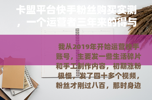 我从2019年开始运营快手账号,主要发一些生活碎片和手工制作内容,初期涨粉极慢,发了四十多个视频,粉丝才刚过八百,那时身边有人建议我去卡盟平台买点粉丝,说能快速突破冷启动阶段,我半信半疑,但架不住焦虑,第一次尝试了这种操作,没想到,这一试就是三年,中间换了十几个平台,花了几千块钱,踩过坑也摸出些门道,今天把这三年里和卡盟平台打交道的经历写出来,给想走这条路的人一点参考。