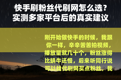 刚开始做快手的时候,我跟你一样,辛辛苦苦拍视频,播放量就几十个,粉丝涨得比蜗牛还慢,后来听同行说可以找代刷网买点粉丝,我就试了几家,踩过坑也捡到过宝,今天把这几个月用下来的真实感受写出来,给想走点“捷径”的朋友一个参考。