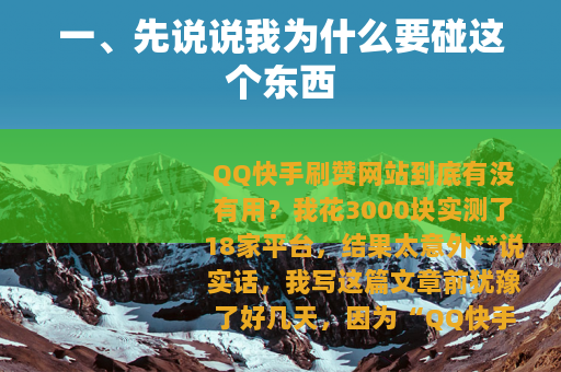QQ快手刷赞网站到底有没有用?我花3000块实测了18家平台,结果太意外** 说实话,我写这篇文章前犹豫了好几天,因为“QQ快手刷赞”这个话题,在圈子里一直带着点模糊的灰色,太多人要么把它吹得神乎其神,要么把它说得一文不值,我既不想当托,也不想当喷子,我只是一个普通的内容创作者,从2018年开始在快手发段子,后来断断续续做QQ空间营销,期间跟至少30家刷赞平台打过交道,前后投入的钱加起来够买一台中档笔记本了,今天我想把这些真实的、带血带泪的经历掰开了揉碎了讲给你听,不装、不演、不藏着掖着。