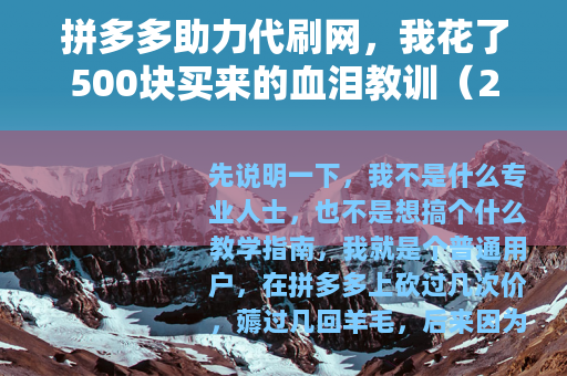 先说明一下,我不是什么专业人士,也不是想搞个什么教学指南,我就是个普通用户,在拼多多上砍过几次价,薅过几回羊毛,后来因为实在凑不够人数,就动了歪心思——想找那种所谓的“助力代刷网”,结果呢?钱花了,号差点废了,东西倒是拿到过两次,但后面差点被反撸,这篇东西,就是把我这三个月里的经历、观察、还有自己琢磨出来的门道,原原本本写出来,如果你也在犹豫要不要买那玩意儿,建议你花十分钟看完,省得走我的老路。