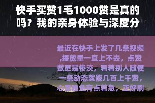最近在快手上发了几条视频,播放量一直上不去,点赞数更是惨淡,看着别人随便一条动态就能几百上千赞,心里难免有点着急,正好刷到有人打出“1毛钱1000赞”的广告,当时第一反应是:这么便宜?不会是骗人的吧?但转念一想,就算被坑也就几块钱的事,不如试试看,于是我就花了三天时间,亲自测试了七八家不同的低价赞卖家,还顺带研究了背后的机制,这篇文章就把我所有的经历、观察和思考写下来,希望能给同样在纠结买赞的朋友一点参考。