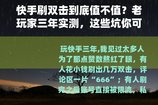 玩快手三年,我见过太多人为了那点赞数熬红了眼,有人花小钱刷出几万双击,评论区一片“666”;有人刷完之后账号直接被限流,私信问我的时候哭都哭不出来,今天我就把这三年来自己试过、身边朋友踩过的关于快手刷双击的那些事,原原本本讲给你听,没有套话,只有干货。