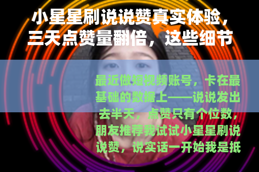 最近做短视频账号,卡在最基础的数据上——说说发出去半天,点赞只有个位数,朋友推荐我试试小星星刷说说赞,说实话一开始我是抵触的,总觉得这种“外力”会不会把账号搞废,但眼看同期的创作者靠互动量上了推荐,我也咬牙花了三十块钱试了一波,三天过去,说说点赞从个位数飙到一百多,虽然没爆火,但数据确实好看了不少,这篇文章就讲讲我实际用下来的操作细节、效果对比,以及哪些地方容易踩坑——不是那种“避雷指南”,就是普通用户的真实记录。