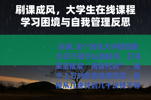刷课,这个词在大学校园里早已不是什么新鲜事,打开某宝搜索“网课代刷”,成千上万的商家蜂拥而至,价格从几块钱到几十块钱不等,承诺“快速完成”“全程托管”“不影响成绩”,我身边不少同学都在用,甚至有人一口气买了五六门课的代刷服务,只为了腾出时间打游戏、实习或者“做点正事”。
