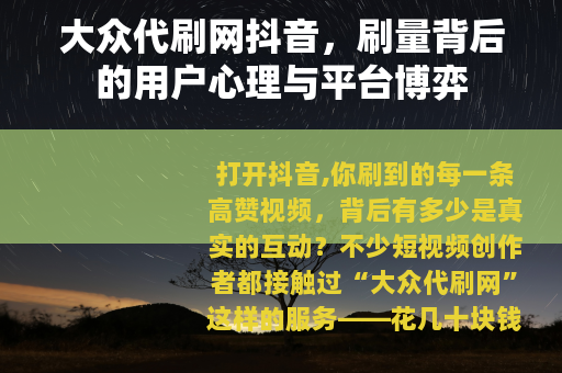 打开抖音,你刷到的每一条高赞视频,背后有多少是真实的互动?不少短视频创作者都接触过“大众代刷网”这样的服务——花几十块钱买几百个点赞、粉丝或播放量,让自己的视频看起来更“火”,这种灰色操作在抖音生态里持续存在,甚至催生了规模不小的产业链,但奇怪的是,一边是平台不断升级的算法检测,一边是用户依然前赴后继地找代刷,这中间到底发生了什么?