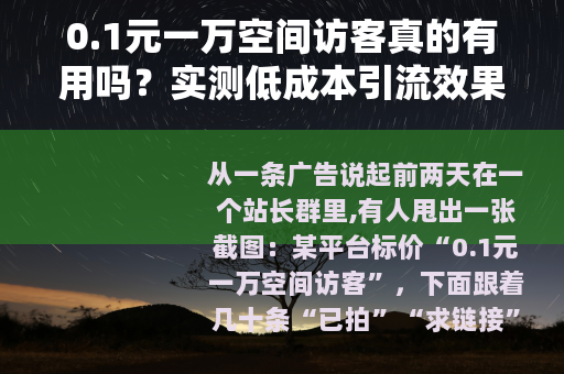 前两天在一个站长群里,有人甩出一张截图:某平台标价“0.1元一万空间访客”,下面跟着几十条“已拍”“求链接”,我当时第一反应是:这价格比矿泉水还便宜,刷一万次访问才一毛钱,到底图什么?后来私下问了几个用过的朋友,说法两极分化,有人说纯粹浪费服务器资源,有人却靠它冲了排行榜前几名,引来了真实流量。