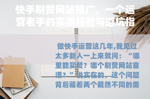 做快手运营这几年,我见过太多新人一上来就问:“哪里能买赞?哪个刷赞网站靠谱?”说实在的,这个问题背后藏着两个截然不同的需求:有人想快速起号,有人纯粹想满足虚荣心,而今天这篇文章,我就以一个在快手摸爬滚打三年、试过不下二十个刷赞网站的老运营身份,跟你聊聊快手刷赞网站推广这件事到底该怎么操作、注意什么、以及哪些钱值得花。