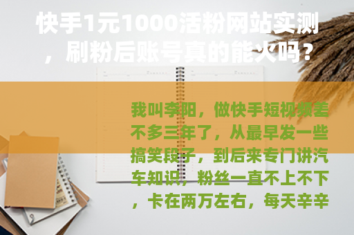 我叫李阳,做快手短视频差不多三年了,从最早发一些搞笑段子,到后来专门讲汽车知识,粉丝一直不上不下,卡在两万左右,每天辛辛苦苦拍剪,播放量就几百,涨粉全靠缘分,去年年底,一个同行在群里甩了个链接,上面写着“快手活粉,1元1000个,秒到,不掉粉”,我盯着那个价格愣了几秒——1块钱换1000个粉丝?哪怕只有十分之一是真人,也比我花一百块投粉条划算得多,那天晚上我怀着好奇点进去,填了快手ID,付了1块钱,然后刷新主页,粉丝数真的从20134跳到了21134,那一瞬间我心跳加速,以为找到了捷径,但接下来的三个月,我全明白了。