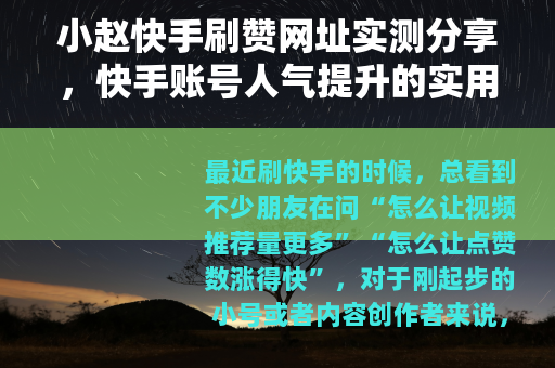 最近刷快手的时候,总看到不少朋友在问“怎么让视频推荐量更多”“怎么让点赞数涨得快”,对于刚起步的小号或者内容创作者来说,前期的曝光确实是个门槛,我试过很多种方式,后来在一个老玩家群里听说了“小赵快手刷赞网址”,抱着试试看的心态用了一段时间,今天把真实感受写出来,给同样在摸索的人一点参考。