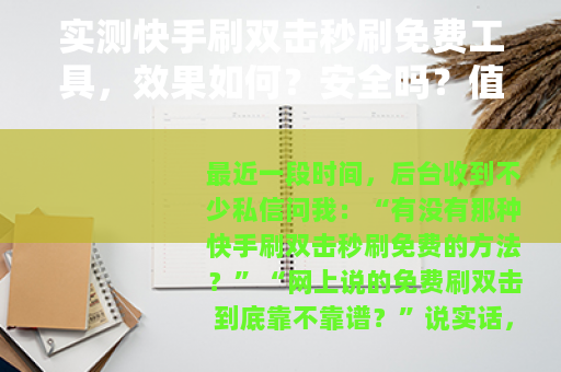 最近一段时间,后台收到不少私信问我:“有没有那种快手刷双击秒刷免费的方法?”“网上说的免费刷双击到底靠不靠谱?”说实话,这个问题我关注了很久,作为一个在快手摸爬滚打三年的老用户,我见过太多人为了那点播放量和双击数,走了不少弯路,今天我就把自己亲身测试的结果、踩过的坑,以及从技术角度看到的现象,原原本本写出来,不卖关子,不搞噱头,全是真实体验。
