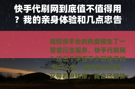 短视频平台的热度催生了一整套衍生服务,快手代刷网”这三个字在不少玩快手的用户心里,既带着点好奇,又带着点犹豫,我自己做快手账号差不多两年,从一开始纯手工涨粉,到后来也试过几次代刷服务,中间踩过坑,也摸到了一些门道,今天就把这些经历摊开来聊聊,希望能给还在纠结的朋友一点参考。
