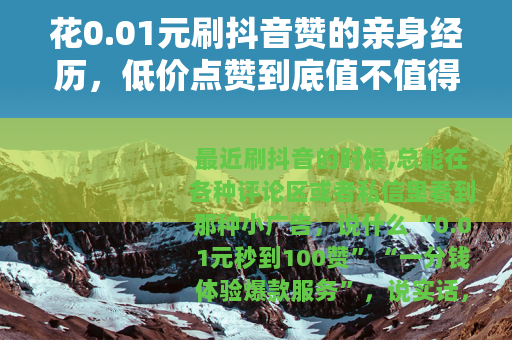 最近刷抖音的时候,总能在各种评论区或者私信里看到那种小广告,说什么“0.01元秒到100赞”“一分钱体验爆款服务”,说实话,我一开始也抱着“试试又不亏”的心态,毕竟就一分钱,买根棒棒糖都不够,于是找了个看起来挺正规的平台(其实也就一个网页链接,输入视频链接就能下单),真付了0.01元,选了100个赞。