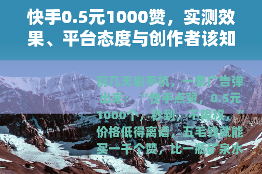 前几天刷手机,一条广告弹出来:“快手点赞,0.5元1000个,秒到,不降权。”价格低得离谱,五毛钱就能买一千个赞,比一瓶矿泉水还便宜,说实话,我当时第一反应是——这不就是假的吗?但转念一想,既然有人卖,肯定也有人买,于是抱着“反正就五毛钱”的心态,我花了半小时,在某个第三方平台上下了单,测试了一下这个传说中的低价赞服务。
