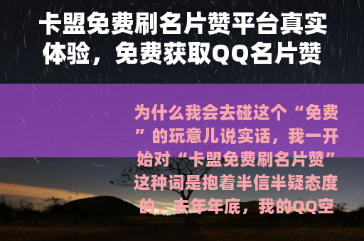 说实话,我一开始对“卡盟免费刷名片赞”这种词是抱着半信半疑态度的,去年年底,我的QQ空间突然被一个朋友刷屏了——他发了一张截图,自己的QQ名片点赞数从两位数直接飙到了四位数,评论区一堆人喊着“老哥求带”,我当时正在做一个小众的兴趣社群,想着如果能快速提升一下自己的QQ名片数据,至少能让新加群的人觉得“这人有点东西”,就动了心思。