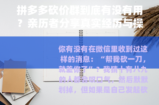 我就是那个曾经对砍价不屑一顾,最后却一头扎进十几个砍价群的人,今天不绕弯子,直接聊一聊:砍价群到底能不能让你成功拿到东西?里面的水有多深?怎么用才能真的省时间而不是浪费时间?