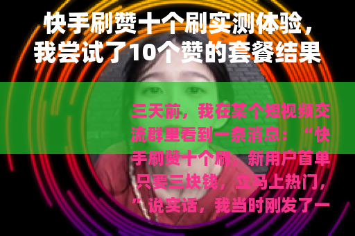三天前,我在某个短视频交流群里看到一条消息:“快手刷赞十个刷,新用户首单只要三块钱,立马上热门。”说实话,我当时刚发了一个精心剪辑的旅行Vlog,播放量卡在87已经整整两个小时,评论区只有自己回复的两条留言,那种感觉就像你精心打扮去参加聚会,结果整晚没人看你一眼,所以我点开了那个链接,花三块钱买了“十个刷”的基础套餐——也就是十个机器赞,今天我想把这三天里发生的真实变化,从数据到感受,原原本本写出来,给有同样困惑的朋友做个参考。
